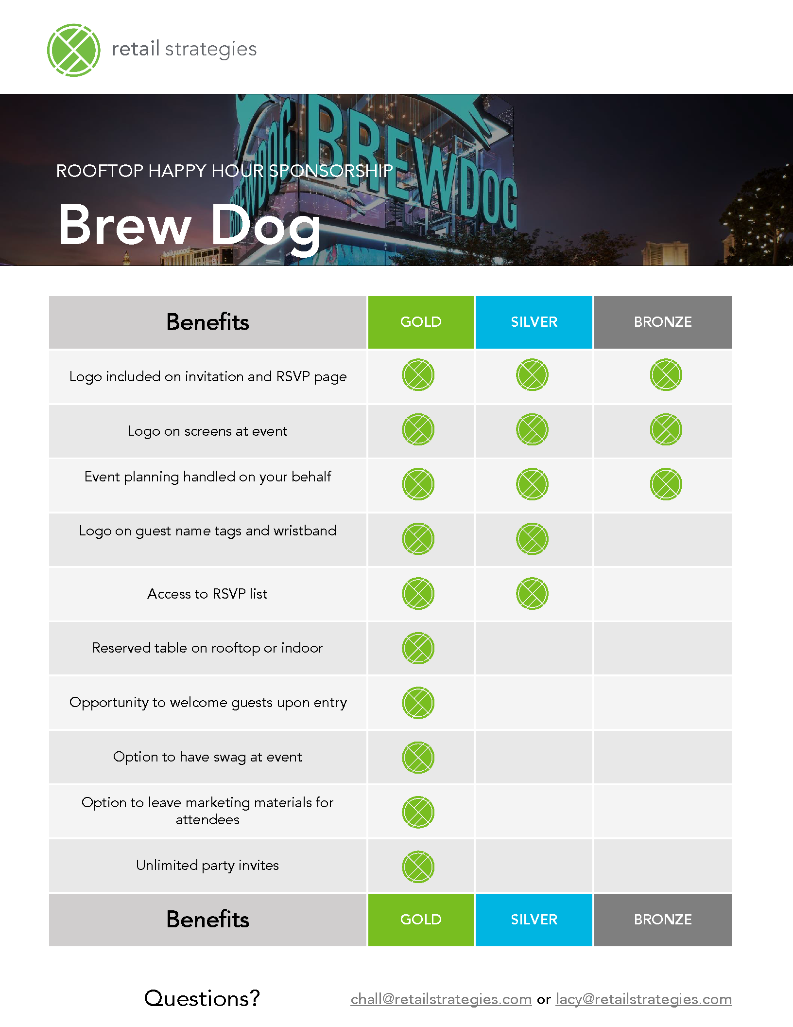 Co-host one of the largest after-hours events at ICSC Vegas! Monday, May 20, from 6-8 PM Rooftop at Brewdog **250+ guests** CHOOSE from BRONZE, SILVER, or GOLD payment includes 3% credit card service fee